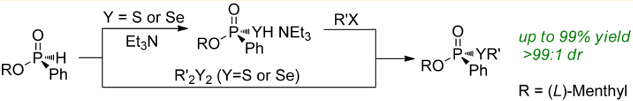 (59) Qing Xu,   Chang-Qiu Zhao, Li-Biao Han.* Stereospecific   Nucleophilic Substitution   of Optically Pure   H-Phosphinates: A General Way for the   Preparation of Chiral P-Stereogenic Phosphine Oxides. J. Am. Chem. Soc. 2008,   130 (38), 12648-12655 (SCI-I, IF: 12.113). DOI:10.1021/ja804412k