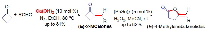 (37) Lei   Yu,* Yulan Wu, Hongen Cao, Xu Zhang, Xinkang Shi, Jie Luan, Tian Chen, Yi Pan,   Qing Xu.* Facile Synthesis of 2-Methylenecyclobutanones via   Ca(OH)2-Catalyzed Direct Condensation of Cyclobutanone with   Aldehydes and (PhSe)2-Catalyzed Baeyer-Villiger Oxidation to   4-Methylenebutanolides. Green Chem. 2014, 16   (1), 287-293 (SCI-II,   IF: 8.02).   DOI:10.1039/C3GC41562G