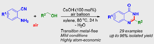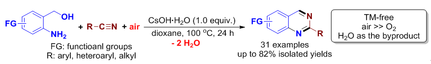 (9)     Song Yao, Kaijing Zhou, Jiabing Wang,   Hongen Cao, Lei Yu, Jianzhang Wu,* Peihong Qiu,* Qing Xu.*   Synthesis of 2-Subsitituted Quinazolines by CsOH-Mediated Direct Aerobic Oxidative   Cyclocondensation of 2-Aminoarylmethanols with Nitriles in Air. Green   Chem. 2017,   19 (13), 2945-2951 (SCI新一区,IF   8.506). DOI:   10.1039/ C7GC00977A