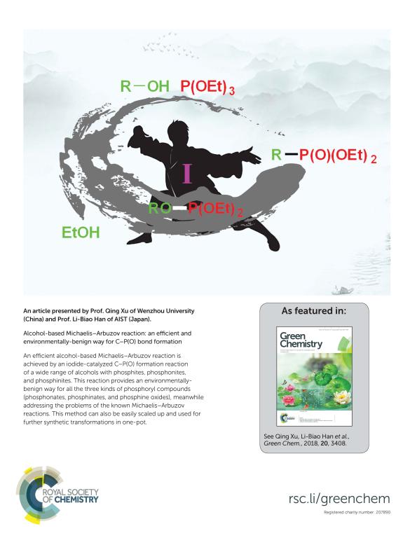 (4)     Xiantao Ma, Qing Xu,*   Huan Li, Chneliang Su, Lei Yu, Xu Zhang, Hongen Cao and Li-Biao Han,*   Alcohol-Based Michaelis-Arbuzov Reaction: an Efficient and Environmentally-Benign   Way for C-P(O) Bond Formation. Green Chem. 2018, 20 (15),   3408-3413. (SCI新一区,IF   8.506). DOI:   10.1039/c8gc00931g