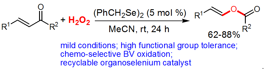 (29) Xu   Zhang, Jianqing Ye, Lei Yu,* Xinkang Shi, Ming Zhang, Qing   Xu,* Mark Lautens. Organoselenium-Catalyzed Baeyer-Villiger Oxidation   of α,β-Unsaturated Ketones by Hydrogen Peroxide to Access Vinyl Esters. Adv.   Synth. Catal. 2015,   357 (5), 955-960 (SCI-II,   IF: 5.663).  DOI:   10.1002/adsc.201400957