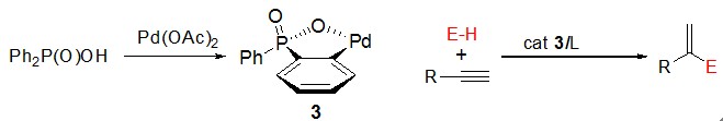 (56) Qing Xu,   Ruwei Shen, Yutaka Ono, Ritsuko Nagahata, Shigeru Shimada, Midori Goto,   Li-Biao Han.* A New Oxapalladacycle Generated via Ortho C-H Activation of Phenylphosphinic   Acid: Efficient Catalyst for Markovnikov-Type Additions of E-H Bonds to   Alkynes. Chem. Commun. 2011, 47 (8),   2333-2335 (SCI-II, IF: 6.834). DOI:10.1039/c0cc03436c