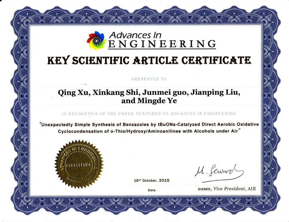(26) Xinkang Shi, Junmei Guo, Jianping Liu,   Mingde Ye, Qing Xu.* Unexpectedly   Simple Synthesis of Benzazoles by t-BuONa-Catalyzed Direct Aerobic   Oxidative Cyclocondensation of o-Thio/Hydroxy/Aminoanilines   with Alcohols under Air. Chem.   Eur. J. 2015,   21 (28), 9988-9993 (SCI-II, IF: 5.731). DOI:   10.1002/chem.201501184