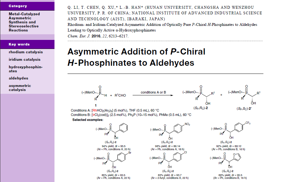 (21) Qiang Li, Tieqiao Chen, Qing   Xu,* Li-Biao Han.* Rhodium- and Iridium-Catalyzed Asymmetric Addition of Optically   Pure P-Chiral H-Phosphinates to Aldehydes Leading to Optically Active   α-Hydroxyphosphinates. Chem.   Eur. J. 2016,   22 (18), 6213-6217. (SCI-II, IF: 5.731) DOI:dx.doi.org/10.1002/chem.201600115