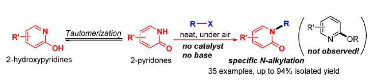 (5)     Bin Feng, Yang Li, Huan Li, Xu   Zhang, Huamei, Xie, Hongen Cao, Lei Yu, and Qing Xu,*   Specific N-Alkylation of Hydroxypyridines Achieved by a Catalyst- and   Base-Free Reaction with Organohalides. J. Org. Chem. 2018,   83 (12), 6769–6775.   (SCI-II) DOI:10.1021/acs.joc.8b00787