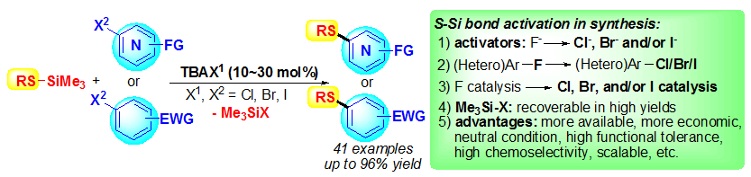(32) Xiaojuan Jia, Lei Yu, Jianping Liu,   Qing Xu,* Marcel Sickert, Lianhui Chen, and Mark Lautens.* Sulfur-silicon   bond activation catalysed by Cl/Br ions: waste-free synthesis of unsymmetrical   thioethers by replacing fluoride catalysis and fluorinated substrates in SNAr   reactions, Green Chem. 2014, 16 (7), 3444-3449 (SCI-II,   IF: 8.02). DOI:10.1039/C4GC00535J
