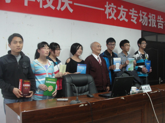 周先生将所著的《化学辞典》、《结构和物性—化学原理的应用》、《结构化学基础》、《化学元素综论》等九本著作作为母校八十校庆的礼物捐赠给了校史博物馆,我院学生代表学校接受了捐赠。讲座中,周先生密切结合当今化学学习的经验,以他最新出版的《化学元素综论》为基础,为师生们深入浅出地解读了化学元素分论、元素周期表等专业知识,资料翔实,内容丰富。同时,他希望同学们能珍惜美好学习时光,刻苦学习,不断完善和充实自己,努力把自己培养成国家和社会所需要的顶尖人才,为母校争光添彩。