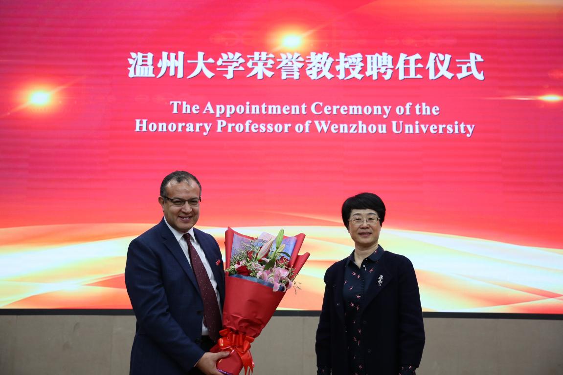 在聘任仪式上,校党委书记林娟娟致欢迎词并介绍学校学院办学历史和近年来在学科建设、国际科研交流与合作等方面情况,化材学院相关负责人介绍了学院在新型能源材料及电池研究取得的一些列成果,林娟娟书记为Khalil Amine教授颁发荣誉教授聘书并佩戴校徽,温州市高教园区建设管委会林照光主任为Khalil Amine教授颁发招才大使聘书。