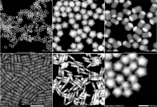 所制备的部分纳米结构电镜照片:Pt纳米环、Au十面体、Ag-Au-Ag纳米棒、Pd-Au-Pd纳米棒,Ag-Au(rod)-Ag纳米棒、Au@Ag十面体