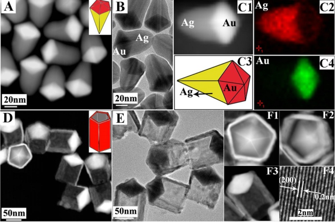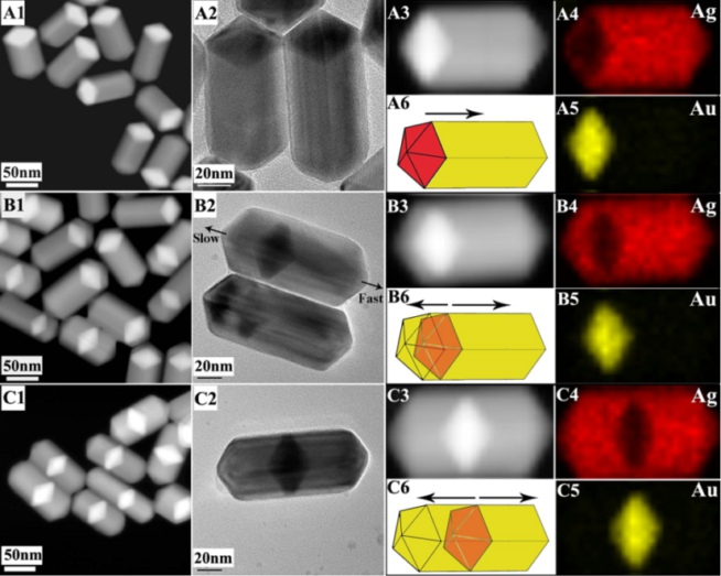日本a片 纳米材料实验室通过用单分散的金十面体纳米颗粒做种子,控制银在其表面的生长动力学,成功实现了非均匀的种子生长过程,制备了一系列新的纳米结构(图