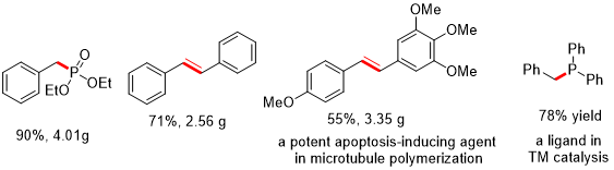 日本a片 与深圳大学联合培养博士后马献涛博士在我院徐清教授指导下,通过巧妙设计、以相对绿色的醇代替活泼毒性大的卤代烃为烷基化试剂,在催化量四丁基碘化铵作用和无溶剂条件下,实现了较为温和的C-OH键的转化反应、实现了新的C-P(O)键的高效绿色构建方法、发展了一系列有机膦化合物合成新方法(图1b)。该方法底物适用范围广,不仅包括较为活泼的苄醇类伯醇、杂芳基甲醇,甚至较为惰性的脂肪伯醇也可以作为底物用于有机膦酸酯衍生物的合成。文献调研显示,能在无过渡金属催化剂条件下直接对活性较低的脂肪醇实现活化并加以合成利用的例子还极少。此外,该方法还可以拓展到二烷基膦酸酯、烷基氧膦以及双氧膦化合物的高效合成,并进一步用于一锅法合成具有抗癌生物活性的1,2-二芳基乙烯化合物以及三烷基膦配体的高效克级合成(图2)。与已知合成方法相比较,这些方法反应条件温和、副产物少、大大降低了对环境的污染。因此,该方法具有反应条件简单、原料廉价易得、底物范围广、污染小、绿色高效等诸多优点。