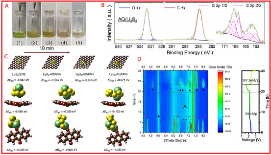 图2.(A)多硫化锂溶液中滴加蒽醌分散液的溶液颜色变化图;(B)多硫化锂-蒽醌复合物的XPS成像;(C)密度泛函理论计算及(D)多硫化锂-蒽醌复合物的原位X射线表征。