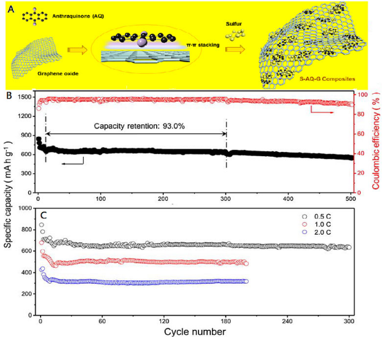 图1A是蒽醌/石墨烯/硫复合正极材料制备的示意图,图1B和1C是锂硫电池的充放电性能测试图。从图可知,蒽醌/石墨烯/硫复合正极材料具有极其稳定的循环能力,在300圈循环内,平均每圈容量仅降低0.019%;0.5C充放电500圈后,总容量仍保持在初始容量的81%以上。这种稳定的充放电行为意味着天然丰富的蒽醌(AQ)小分子可以有效抑制中间多硫化物的溶解及流失。
