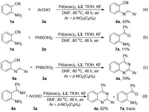 最后,为了阐明该反应的机理,作者设计了一系列对照实验。通过实验表明化合物6a或8a可能是该转化过程的中间体。