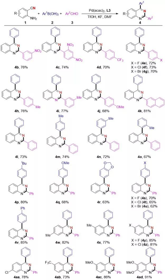 作者对反应条件进行了一系列的筛选,最后确定在双乙酰丙酮钯为催化剂,5,5’-二甲基-2,2’-联吡啶为配体,三氟甲磺酸为添加剂,N,N-二甲基甲酰胺为溶剂的条件下,目标产物可达到最佳收率。然后作者在此最优条件下对反应底物进行了拓展,结果表明:各种取代的邻氨基苯腈、苯硼酸和苯甲醛都能以中等到良好的收率得到目标产物。