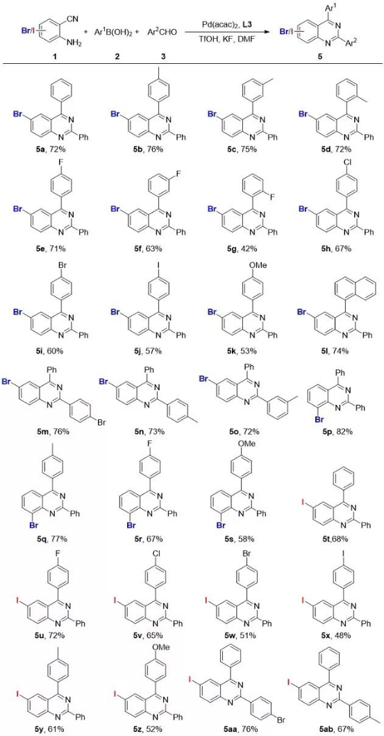 由于含溴或碘等卤代产物可以发生偶联反应,进而得到结构多样化的喹唑啉衍生物。因此,作者利用2-氨基-5-溴苯腈、2-氨基-3-溴苯腈和2-氨基-5-碘苯腈作为底物合成了一系列溴或碘取代的喹唑啉衍生物。