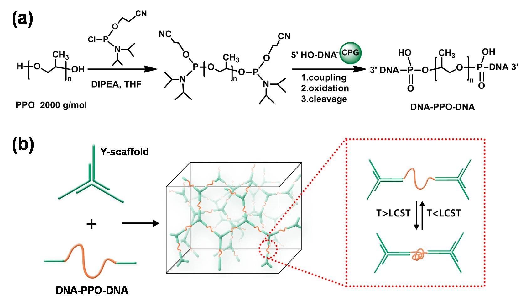 最近,日本a片 吴芬博士、时茜教授和清华大学刘冬生教授、中国科学院化学研究所的范青华研究员共同研究报道了高分子聚环氧丙烷PPO在刚性的三维DNA网络结构中的单分子自我塌缩行为。基于DNA精确的碱基互补配对性质,在骨架中引入具有响应性亲水/疏水转变的高分子链段,在其亲水状态组装成凝胶后再引发转变,由于DNA骨架本身的刚性,这些疏水链段将不能聚集,在单分子水平自塌缩成核,利用流变学测试和小角X射线散射进行表征。并且该一过程是可逆的,为将来嵌段共聚物的成核、生长研究提供一个平台。相关结果已发表在Small(2018,14,170342)上。