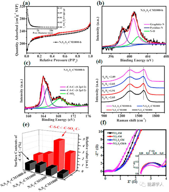 图2.(a)N,S1,S2-CM1000-b的N2吸附 - 解吸等温线和BJH孔分布(插图),(b, c)N,S1,S2-CM1000的N1s和S2p的x-射线光电子能谱,(d)N,S1-CM1000,N,S2-CM1000,N,S1,S2-CM1000,N,S1,S2-CM1000-b的拉曼光谱,(e)不同样品的-CSC-和-C-SOX-C-含量。(f)N,S1-CM1000,N,S2-CM1000,N,S1,S2-CM1000,N,S1,S2-CM1000-b的电化学阻谱(EIS)。