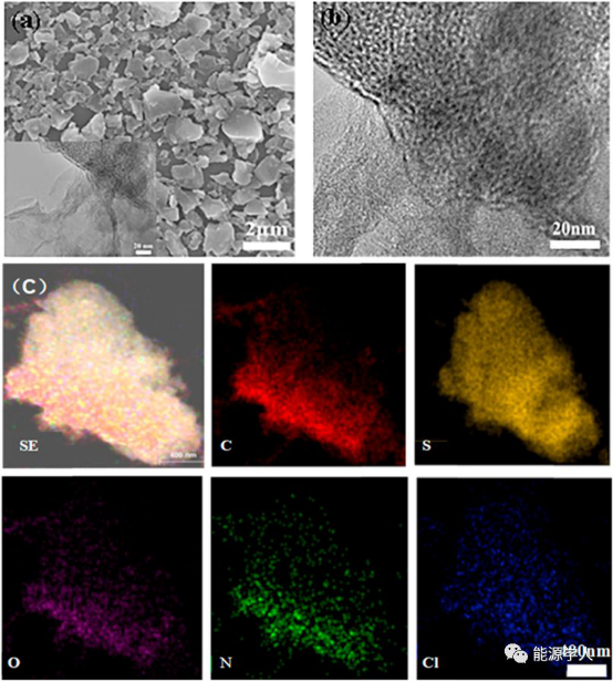 图1.(a)N,S1,S2-CM1000-b的SEM图像和放大的HRTEM(插图),(b)N,S1,S2-CM1000-b的HRTEM,(c)EDS图