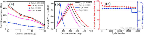 图5.(a)不同氮和硫共掺杂多孔碳材料在不同电流密度下的比电容。(b)不同氮和硫共掺多孔碳材料在1A/g下的充放电曲线。(c)对称两个电极的循环稳定性。