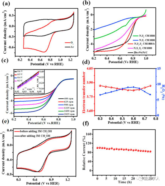 图3.(a)N,S1,S2-CM1000-b阴极在O2和N2饱和溶液中的CV图,(b)Pt/C和不同N和S-共掺杂多孔碳材料的LSV图,(c) N,S1,S2-CM1000-b阴极在不同转速(400-2025 rpm)下的LSV图和相应的KL图(插图),(d)RRDE法测定的N,S1,S2-CM1000-b电子转移数与电压的关系,(e)CV法呈现的N,S1,S2-CM1000-b的抗甲醇性能表征图,(f)N,S1,S2-CM1000-b电催化还原氧还原的稳定性。