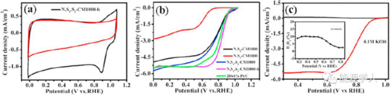 图4.(a)在O气氛中N,S1,S2-CM1000-b的循环伏安图。(b)Pt / C和不同氮和硫共掺杂多孔碳材料的ORR活性的线性扫描伏安图。(c)RRDE法测量的N,S1,S2-CM1000-b和(插入)电子转移数。
