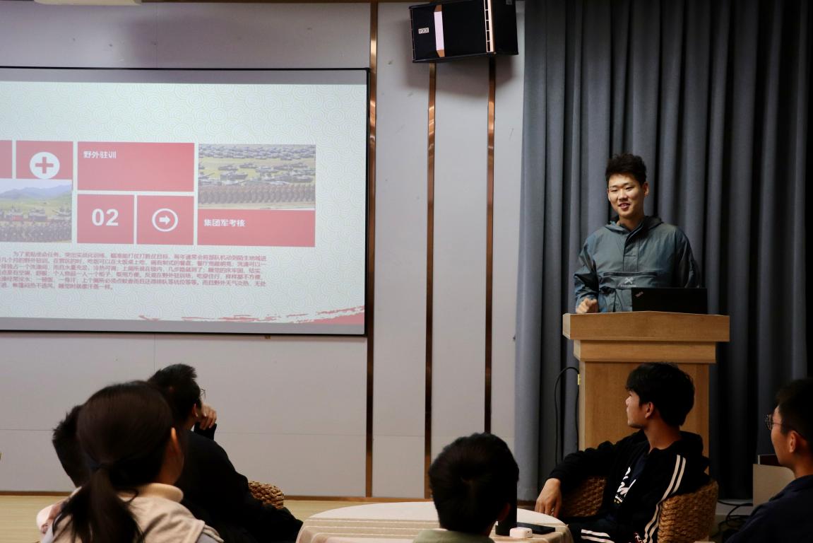 首先由张天祚同学介绍了他的服役单位、部队的基本情况、历史军人名将和解放军战斗序列的分类及相应职责,分享了他在服役期间的军旅经历--遇灾害舍自己救人民、野外驻训、集团军考核、军事演习等既严肃又神圣的经历。其中不乏令人热血、感动和惋惜的经历,这令同学们对军人和部队有了进一步的了解。