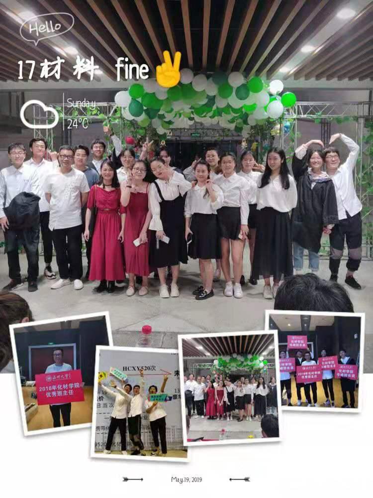 2017材料班一直是一个团结友爱、积极向上的大家庭,更有一位严肃不失幽默的班主任——刘若望,刘若望老师是材料学专业课老师,同学们亲切的称呼他为“旺旺”老师,他的班会永远不会超过半小时,但是从来不会漏讲一个重点,因为班主任在会前将重点进行罗列凝结,为的就是不耽误大家时间还能够传达班会重点,平时“旺旺”老师更像班级同学的大哥,和同学们一起玩耍,带领每一位同学为班团建设努力,班级有10名同学曾被评为校级、院级优秀学生干部、工作积极分子。班级同学也不断积极进取、不断挑战自我,英语四级通过率达85%,六级通过率接近40%,“旺旺”老师鼓励同学参加科研,班级很多同学从大一起就跟随导师进入实验室,进行科研训练,校级科研立项结题率达到100%,获得院级竞赛4项,校级竞赛5项,省级竞赛13项,发表专利近10余项,并成功在知名期刊上发表多篇文章。在考研期间,班级同学互相帮助、相互鼓励,营造良好的学习氛围。