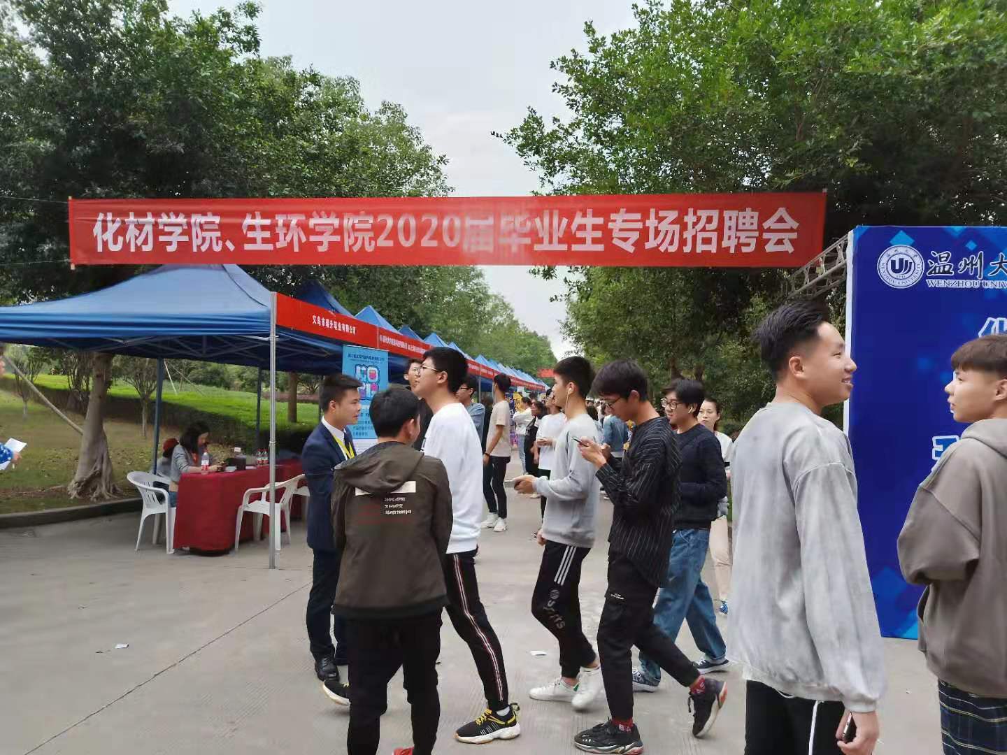化材学院2020届毕业生秋季招聘会正式拉开帷幕。本次招聘会在化材学院教学楼前及化材生环中间主干道举行。近100家用人单位和500余名我院学子以及其他学院闻讯而来的学生们参加了本次招聘会。