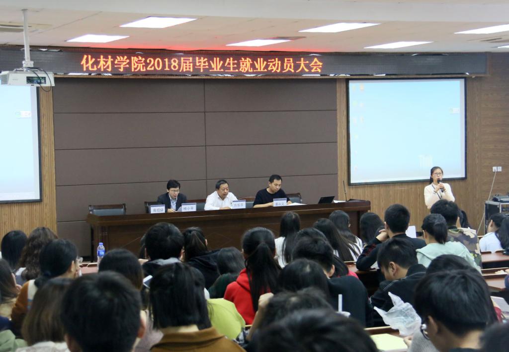为了贯彻落实学校就业处的就业文件指示,帮助2018届毕业生更快、更好地择业与就业。11月8日下午三点半,化材学院在化材楼11C-401室召开了2018届毕业生就业动员大会。学院党总支书记方乐平、副院长杨小平、党总支副书记出席大会,2014级本科生、2015级研究生参加了本次大会。大会由学生科副科长易招娣主持。