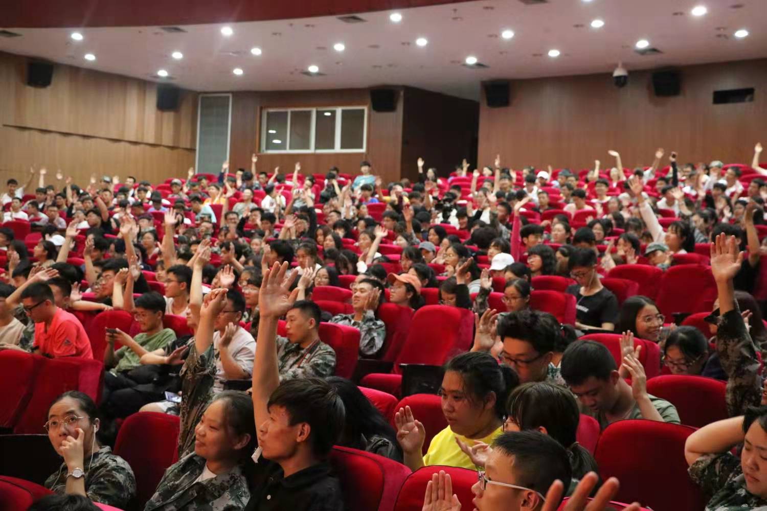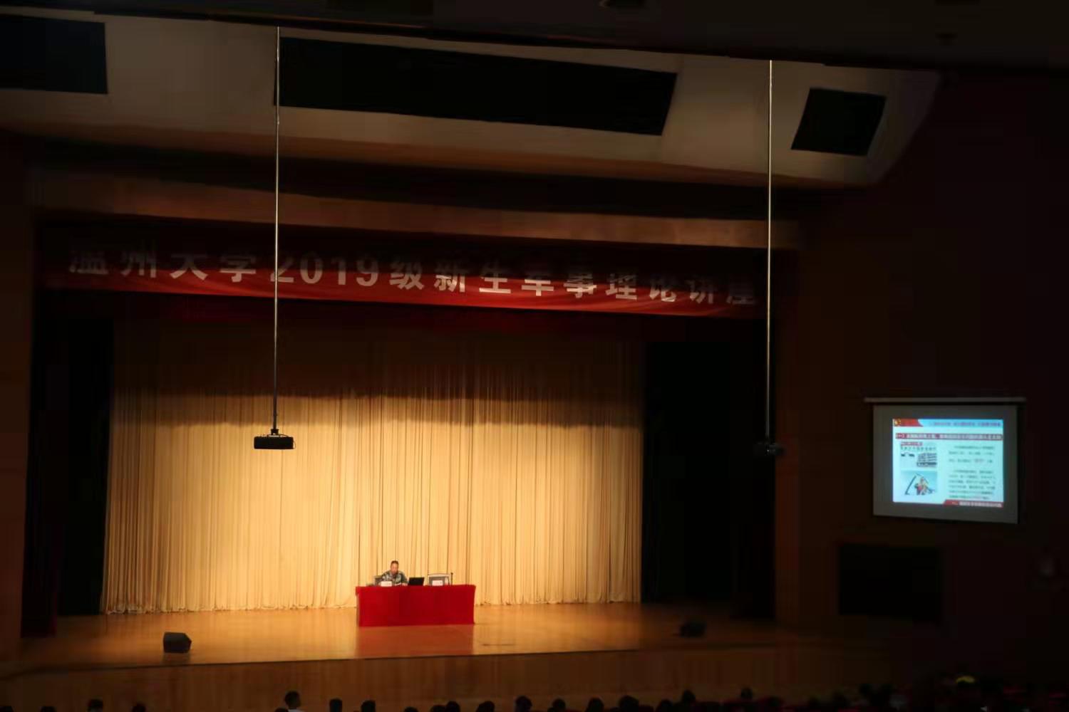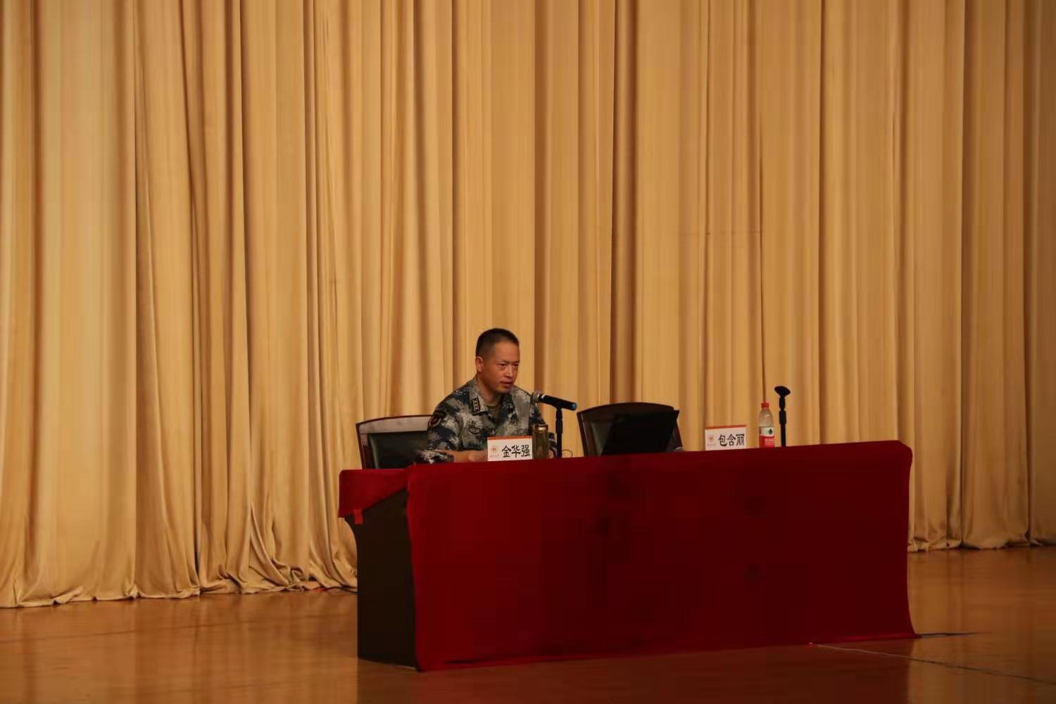 新生作军事理论讲座的主讲人是温州市军分区政治部主任金华强。包含丽老师简单介绍了金华强主任的身份以及过往经历后讲座正式开始。金华强主任的讲话分为我国安全面临的现实问题、国防动员基本概念涵义和重要意义、国防动员系统调整改革情况以及关于国防动员工作的一切思考这四部分。首先,金华强主任通过对国际形势、地缘情况两方面的详细分析,指出了影响我国安全问题的源头和威胁我国安全问题的关键。并播放了介绍东风-41导弹的视频,说明我国在保护国家安全方面是有底气的。接着,金华强主任向同学们一一讲解了国防动员的基本概念、在维护国家安全稳定和发展中的功能以及它的主要内容和主要意义。随后,介绍了国防动员系统调整改革情况和关于国防动员工作的一些思考。最后,金华强主任表达了对同学们未来能为祖国富强做贡献的美好希冀。