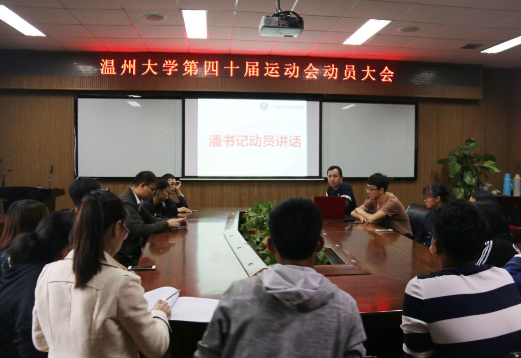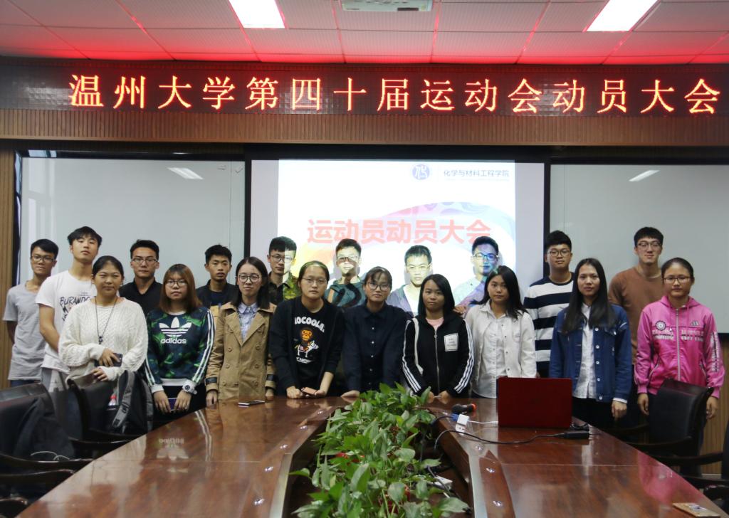 开展2017年第40届运动会的号召,充分调动我院运动员的积极性。11月1日中午,化材学院在化材楼11B204室召开第40届校运会动员大会。出席大会的有学院党总支副书记潘从义、学生科副科长易招娣、研究生辅导员邹涌彬、学生会主席章林祥及全体运动员、后勤保障人员。动员会由易招娣老师主持。