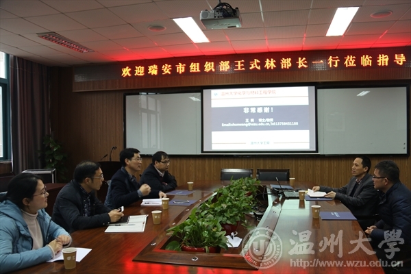 3月23日下午,瑞安市组织部部长王式林一行莅临学院交流,学院院长王舜、副院长陈久喜、院长助理夏远志出席交流会。
