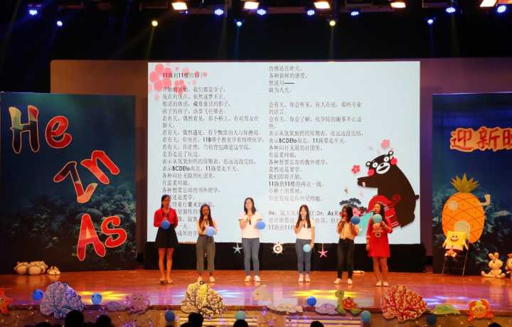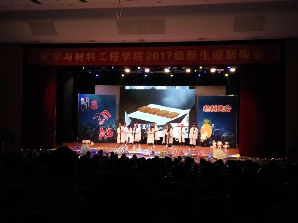 第三篇章“三‘砷’有幸”。诗朗诵《飞翔》让大家对未来四年充满憧憬;紧接着,辅导员林彬彬老师与17化本2班赵凯丽联袂表演《水墨情》,展现中华文化之多娇。接着是暖心时刻,学院精心为在十月份过生日的新生准备了生日蛋糕,在全场同唱的《生日快乐歌》的歌声中,每一位生日的同学都许下了今年的愿望,让在异乡的同学们也有了如家一般温暖的感觉。来自16化本的王路怡同学表示:即使不在家乡化材也总是能给她温暖,带给她力量,让她成为了更好的自己。