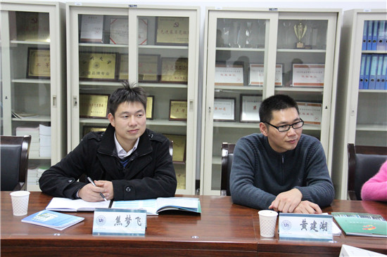随后,孙安梭副书记就学院师资力量、学生管理、党员建设、就业培训等方面与黄建湖书记进行讨论交流。孙安梭副书记在会议上提到:“我院近几年在科研方面取得成果是比较多,这主要是因为我院鼓励学生参与老师的研究实验中,让学生在老师的指导下,积极参与科研竞赛。”