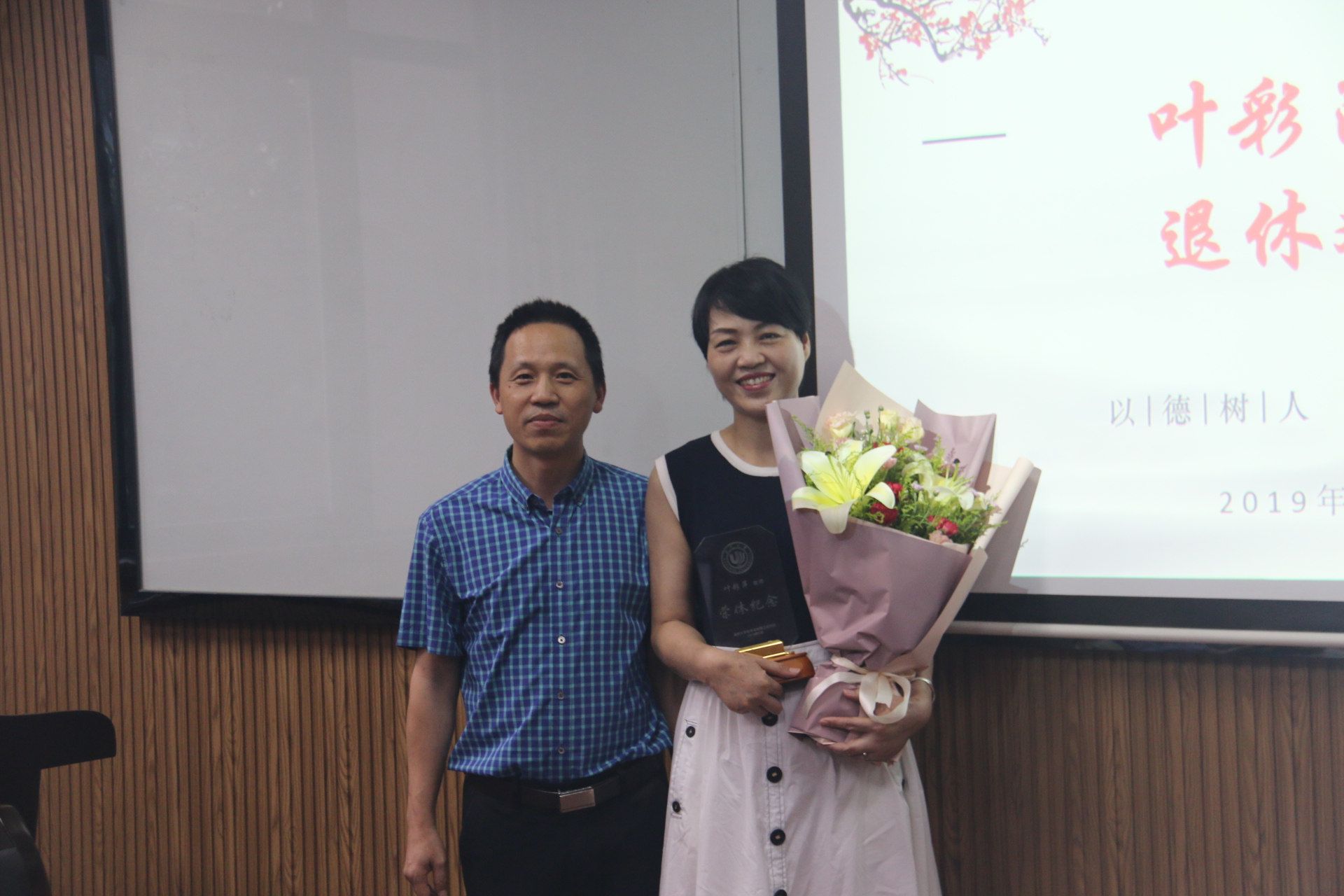最后,由熊琳书记为叶彩萍老师送上鲜花、纪念品,并祝愿她退休后身体健康、青春永驻、生活幸福。