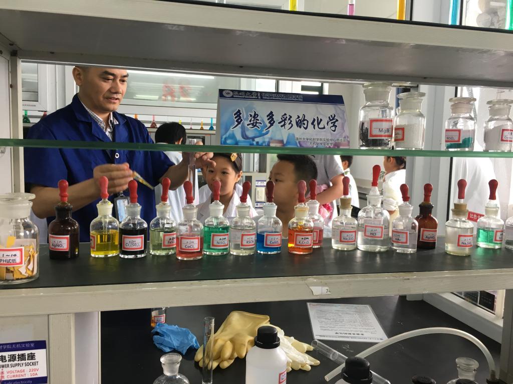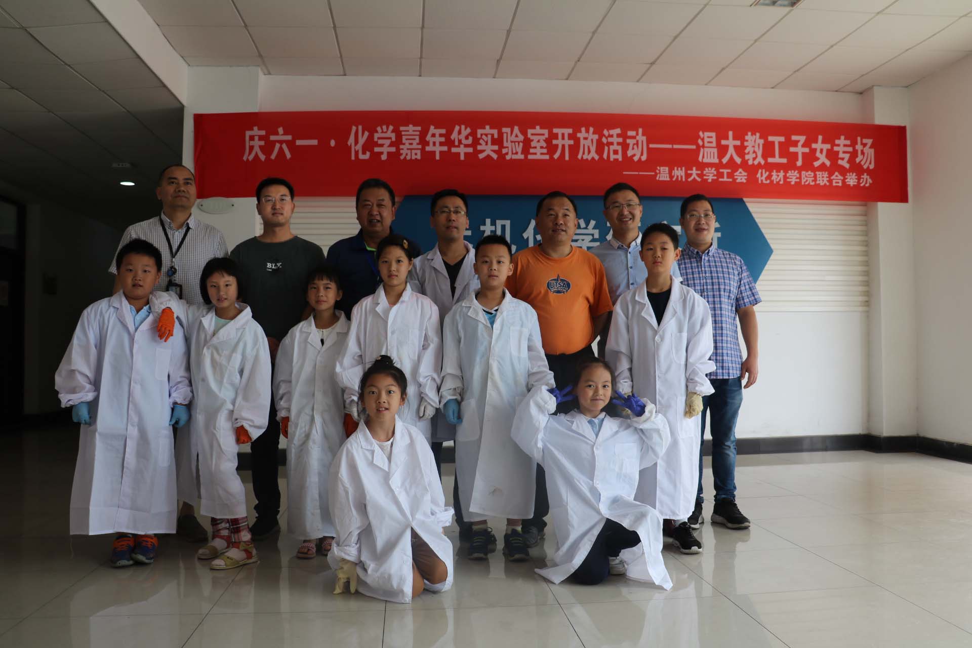 化材学院共同举办了第四期实验室开放日活动,邀请学校教职工子女进入实验室体验生活中的化学,为小朋友们送上”六一”儿童节礼物。当天上午,校工会主席张希均老师,学院党委书记方乐平老师,学院工会主席陈锡安老师、化材学院实验中心教工党支部书记刘妙昌老师及其支部党员教师与大学生志愿者来到现场。