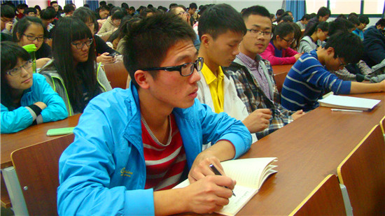 潘老师从繁荣的古代开始娓娓道来,将在座同学引入到深厚的中国历史画卷中。在讲到中国近代史时,他引用了孙中山“革命尚未成功,同志仍需努力”来劝诫在座同学努力学习,“中国梦”的实现依然任重而道远。讲到现代社会历史时,潘老师又从经济、民生两方面进行分析,得出:“目前国际形势风云巨变,动一发而牵全身,面对这样严峻的外部环境,中国首先要稳定内部,要团结一致,要用改革开放的视野不断推进。‘中国梦’的实现,在座你、我、他都有责任,也有义务尽一份心,出一份力。”潘老师也举出了最近中央会议的中心内容,给在座同学及学生党员,进行深入浅出地剖析。