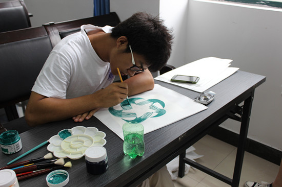 上午8点30分,队员们于11B-208会议室集合。队长首先详细介绍了今天的工作任务,包括环保袋的绘制,泡沫块制图,环保知识竞答的题目准备。根据个人特长,大家被分成若干组展开制作。作为化学专业学生,队员们对于手工制作有少许生疏,但这并不影响队员们拿出漂亮的成果。在绘制过程中,大家借助手中的手机,电脑寻找与环保和垃圾分类相关的图片,只见队员们认真地面对着电脑和手机屏幕,细致地将合适的图片临摹到环保垃圾袋和白色塑料泡沫上,并不时地涂涂改改,力争克服自己的专业弱项。在上色阶段,队员们齐心协力,不论自己来自于哪一个小组,都热心地参与到“上色”这个繁重的工作当中。整个手工制作持续了相当长的时间,队员们忙完了一上午之后匆匆吃了午饭又急忙赶回会议室展开紧锣密鼓地制作,队长们更是以身作则,统筹手工制作的各方面任务安排,并提供了画笔,颜料等制作原料。在队员们的共同努力下,50余只绘制精良的环保袋和20余块小巧的泡沫彩绘以及大量环保知识竞答题出炉。