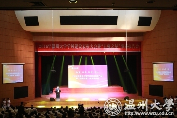 2016年学风建设表彰大会暨“自强之星”事迹报告会在大学生活动中心育英大礼堂举行。校领导李校堃、林娟娟、牟德刚、赵敏、吴金法、陈安金、方益权、潘玉驹,校友陈国同及其夫人刘秋霞,浙江嘉华房地产有限公司总经理陈耀兴,阿联酋温州同乡会会长林时永、执行会长池云虎一行,家长代表,相关部门负责人,各学院、学区分管书记,全体辅导员,相关班主任,学院、学区学生代表参加表彰大会。