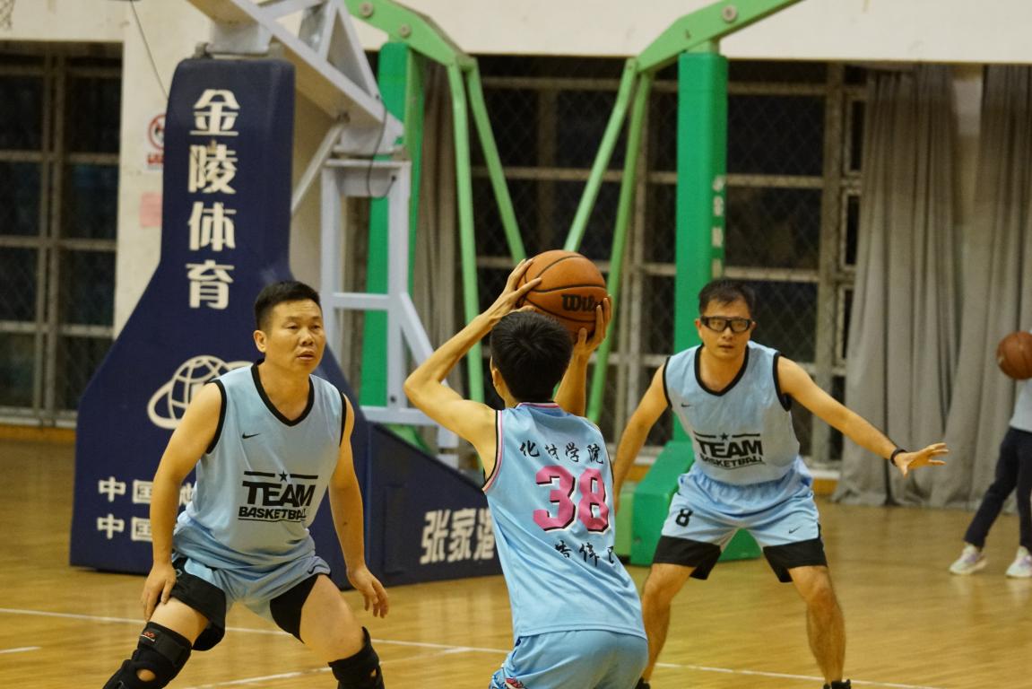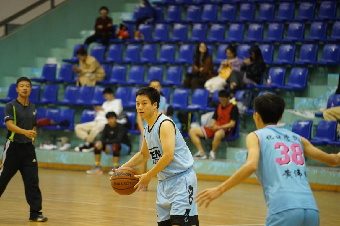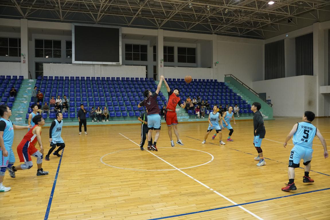 比赛开始前,双方在各自半场认真地热身,期望能在比赛中大显身手,赛场气氛很快地活跃起来。随着裁判一声哨响,球员们迅速就位跳起争球,研究生队凭借体能优势向教师队发起猛攻,而教师队攻防有度、稳扎稳打,凭借精湛的球技,丰富的经验,紧紧咬住比分不放松,中场结束时,研究生队以48:46的比分暂时领先。
