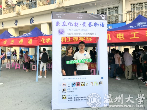 来自17化本班的林同学说:“报到第一天,我真的被学院创意的合影框惊到了,‘春风十锂,化材等你’‘氢春有你’‘钠么美好’等带有化学元素的祝福语洋溢着青春活力又充满了浓浓的化学情。新加入的“化材新元素”们深切感受到来自化材学院的用心,纷纷与自己父母在相框合影留念,纪念这一美好时刻,大学不是终点,是一个新的起点;他们带着父母的期许,自我的追求踏上新的征程。