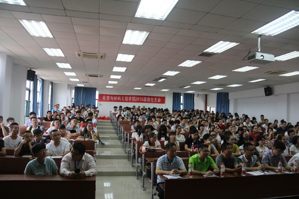 2015年迎新生大会在化材楼11C-401隆重举行。学院全体领导、系主任、辅导员、新生班班主任和281名15级新同学参加大会。会议由党总支书记方乐平主持。