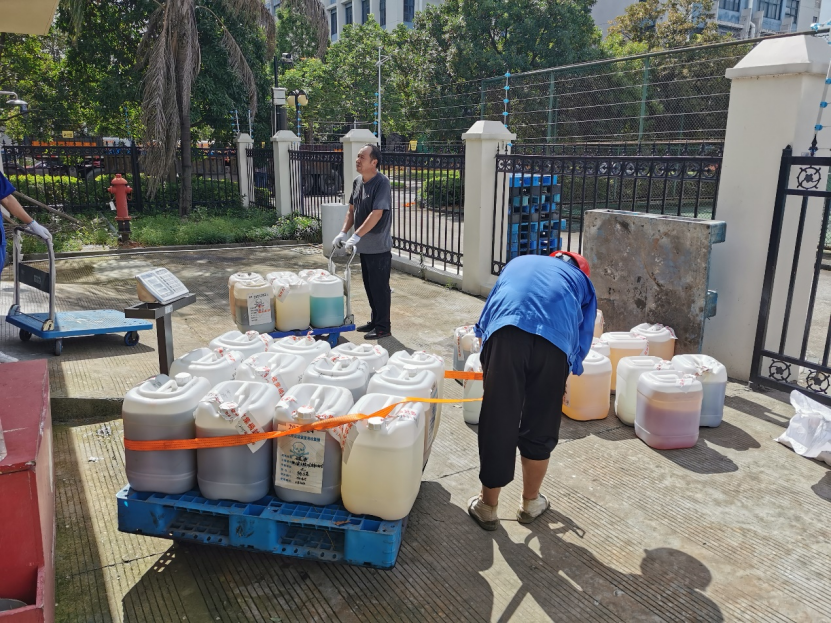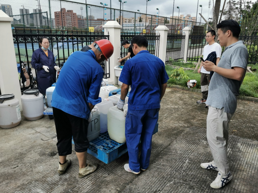 2021年7月6日,在国资与实验室管理处支持下,我院实验中心组织了假期前的实验室危险废弃物的清运工作。