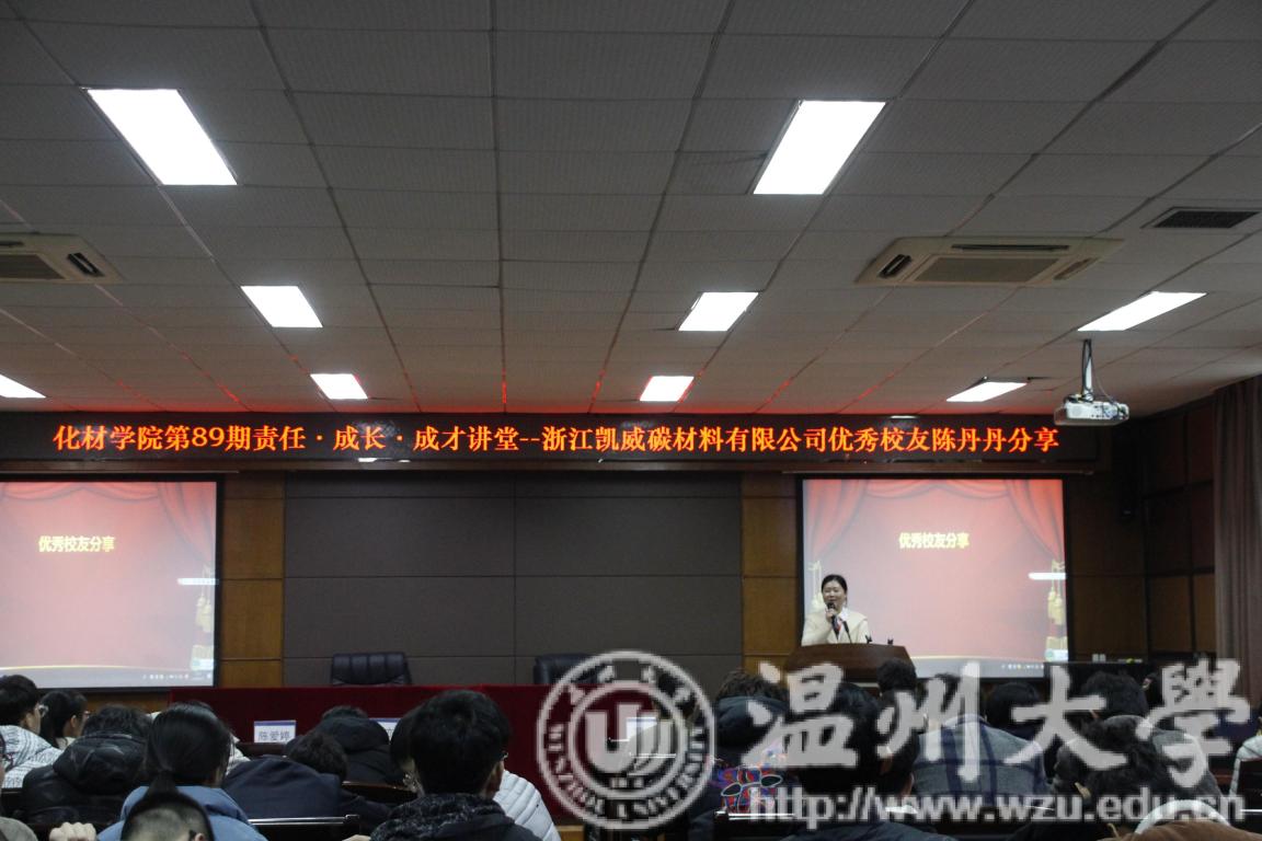 最后,潘从义副书记分别宣读了第一届“凯威碳”新材料设计大赛获奖名单、2018年度“凯威碳励志奖”获奖名单,并由学院领导、浙江凯威碳材料有限公司总经理等为获奖者颁奖。颁奖仪式结束后,我院优秀校友代表陈丹丹还与同学们分享了她在凯威碳任职的经历,同学们纷纷表示要向学姐学习,争取成为一名优秀的大学生。