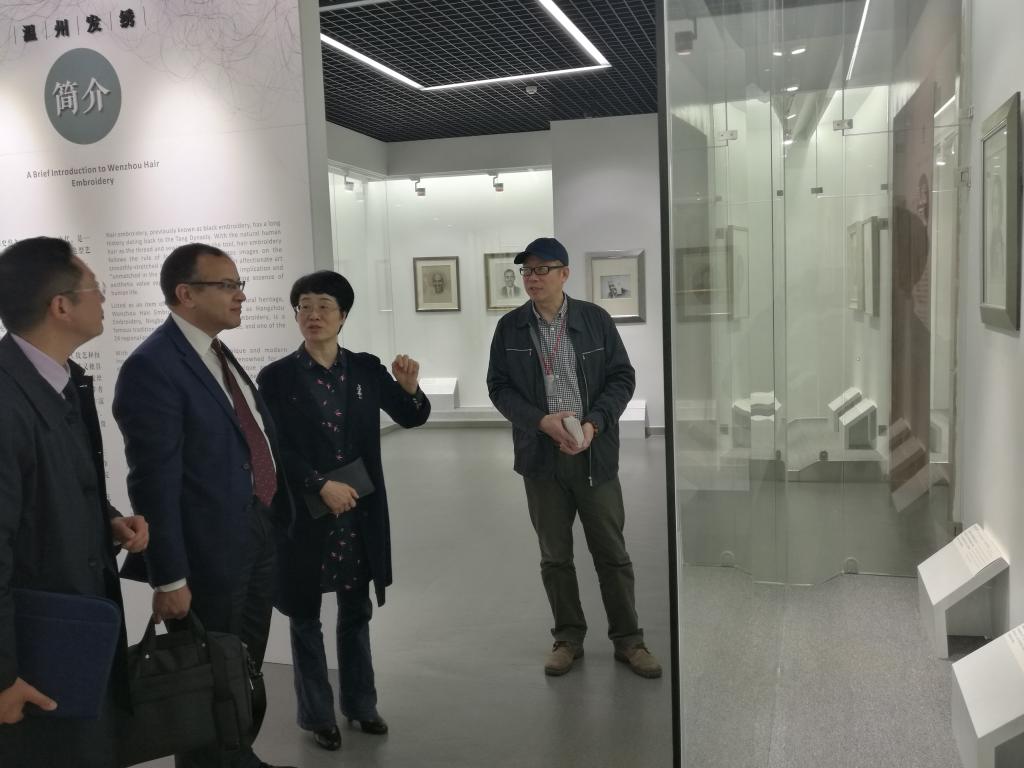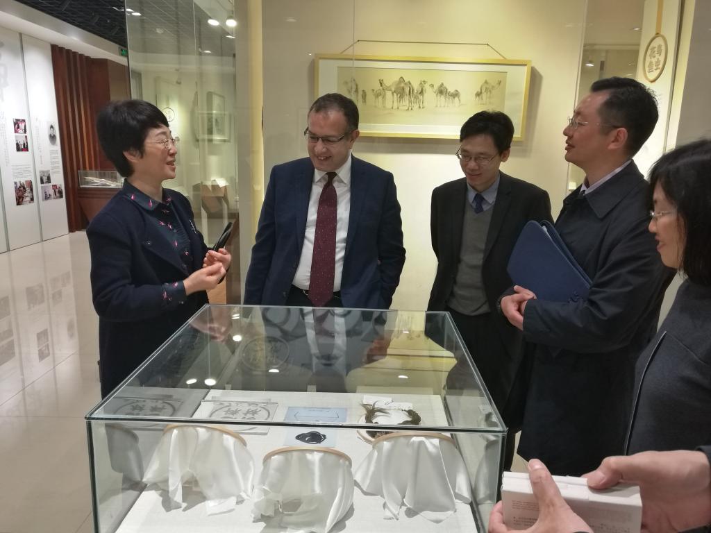 在聘任仪式前,校党委书记林娟娟在学校接见厅接见Khalil Amine教授一行,并陪同参观发绣所。