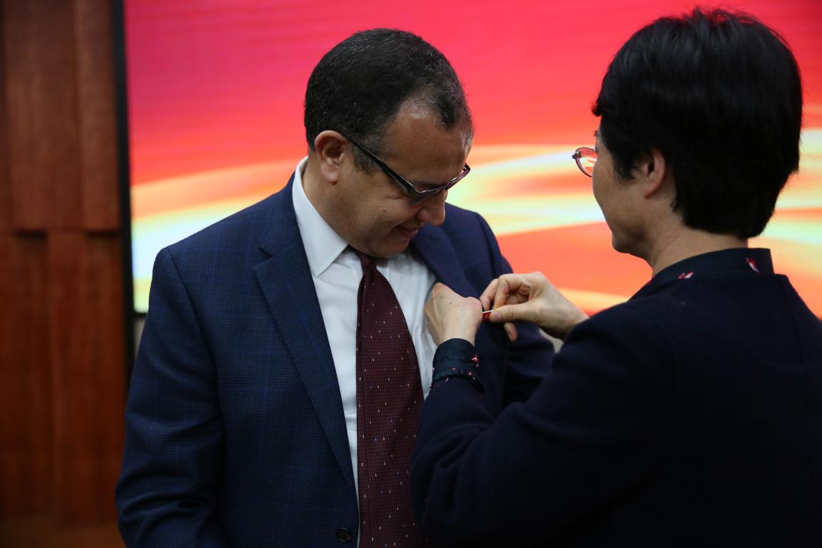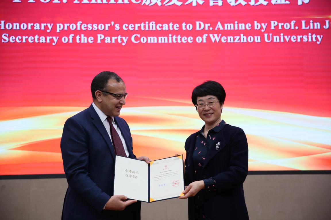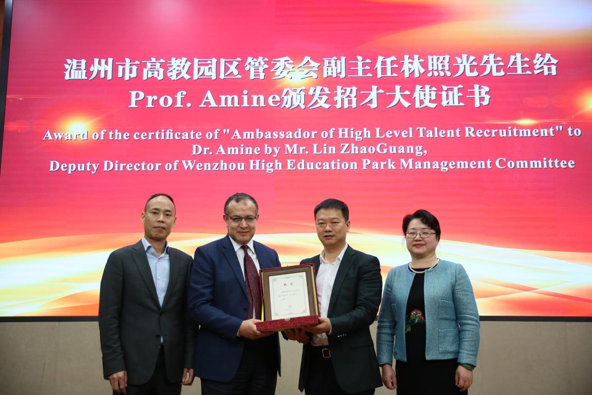 在聘任仪式上,校党委书记林娟娟致欢迎词并介绍学校学院办学历史和近年来在学科建设、国际科研交流与合作等方面情况,化材学院相关负责人介绍了学院在新型能源材料及电池研究取得的一些列成果,林娟娟书记为Khalil Amine教授颁发荣誉教授聘书并佩戴校徽,温州市高教园区建设管委会林照光主任为Khalil Amine教授颁发招才大使聘书。
