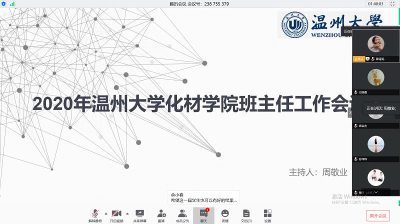 接着,周敬业副书记对本学期学生工作进行部署:第一,安全教育、规则意识是底线,做好学生安全教育,配合完成每日一报健康打卡,外地返温,湖北返浙做好申报;第二,学生学风是基础,各年级分级分类2016级学生考研复试准备,2017级考研学生动员,2018级、2019级补考学业预警学生的帮扶工作;第三,建议班主任召开一次班会专题强调内容,建议毕业班级班主任陆续关心同学就业复试情况。