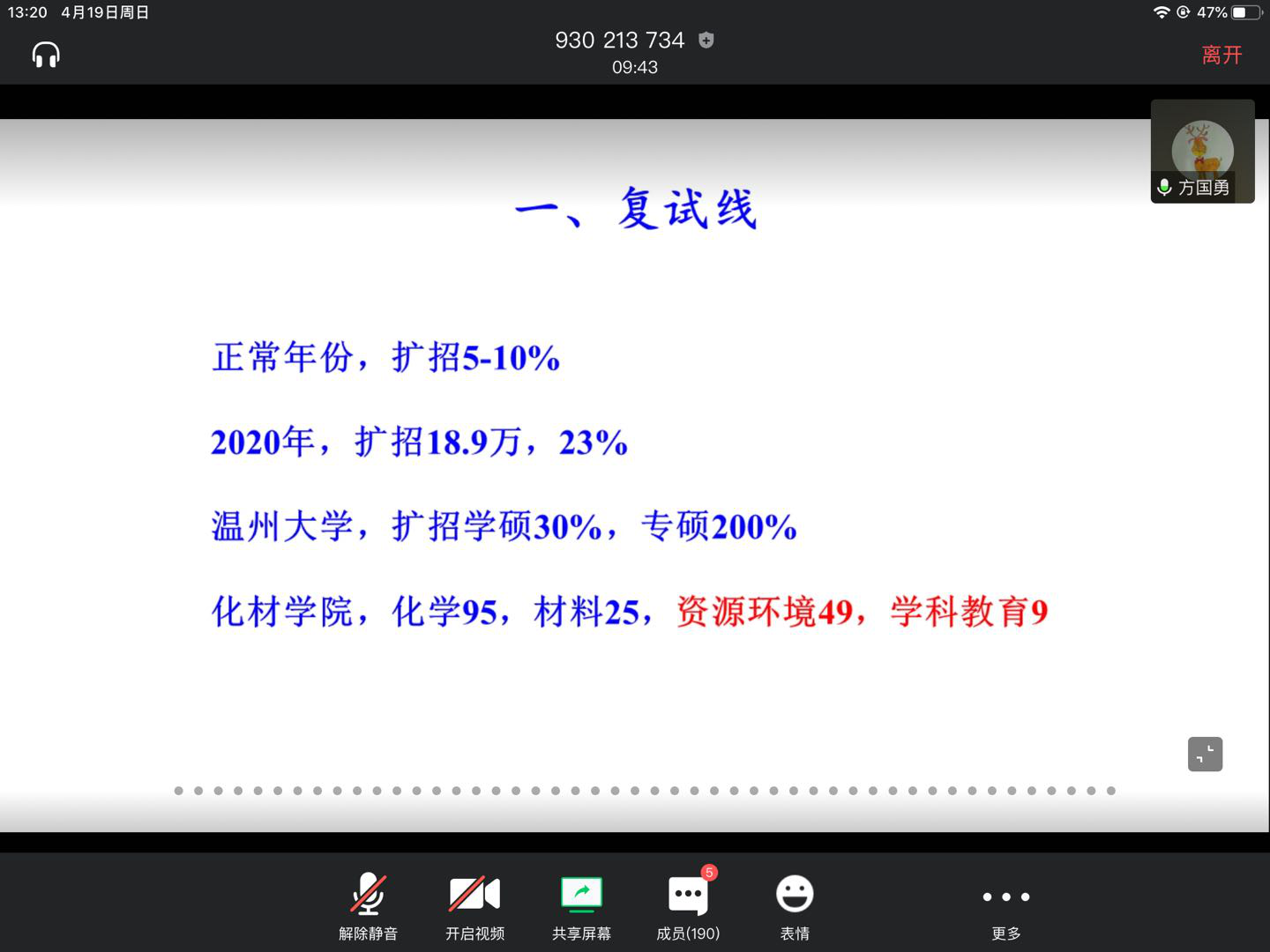接下来,由方国勇老师向同学们介绍了现在的考研形式,较为详细地介绍了复试线、学硕、专硕的区别、适合选择的研究生专业以及不适合选择的专业、考研雷区等等考研相关的信息和往届学生踩雷得到的经验。希望同学们都可以少吃亏、高效考研。刘楠楠老师对方国勇老师的发言进行了补充和完善,提出了一些考研建议,鼓励同学们进行考研,并希望同学们在决定考研以后,可以坚持到底,不要半途而废。