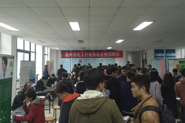下午13点30分,在化材楼B栋二楼大厅,由温州市化工行业协会主办的企业招聘会正式开始。在场招聘的有十一家公司,包括华峰集团有限公司、浙江禾本科技有限公司、一帆生物科技集团有限公司等各化工专业公司。前来应聘的大多数为12级学生,13级的学生也有部分,他们前来,一方面是为了寻求实习岗位,积攒工作经验,另一方面是为了更加了解自己专业的相关就业行情。应聘者的简历内容清晰,能很好的凸显自己的个性和能力。招聘会现场气氛融洽。本次招聘会主要以招工程师、销售代表、检验员和技术员为主。学院方面也是十分注重这次招聘会,学院院长王舜、副院长陈久喜、副书记潘从义也到场与企业及学生进行交流。招聘会大约持续了两个小时,最后顺利落下了帷幕。